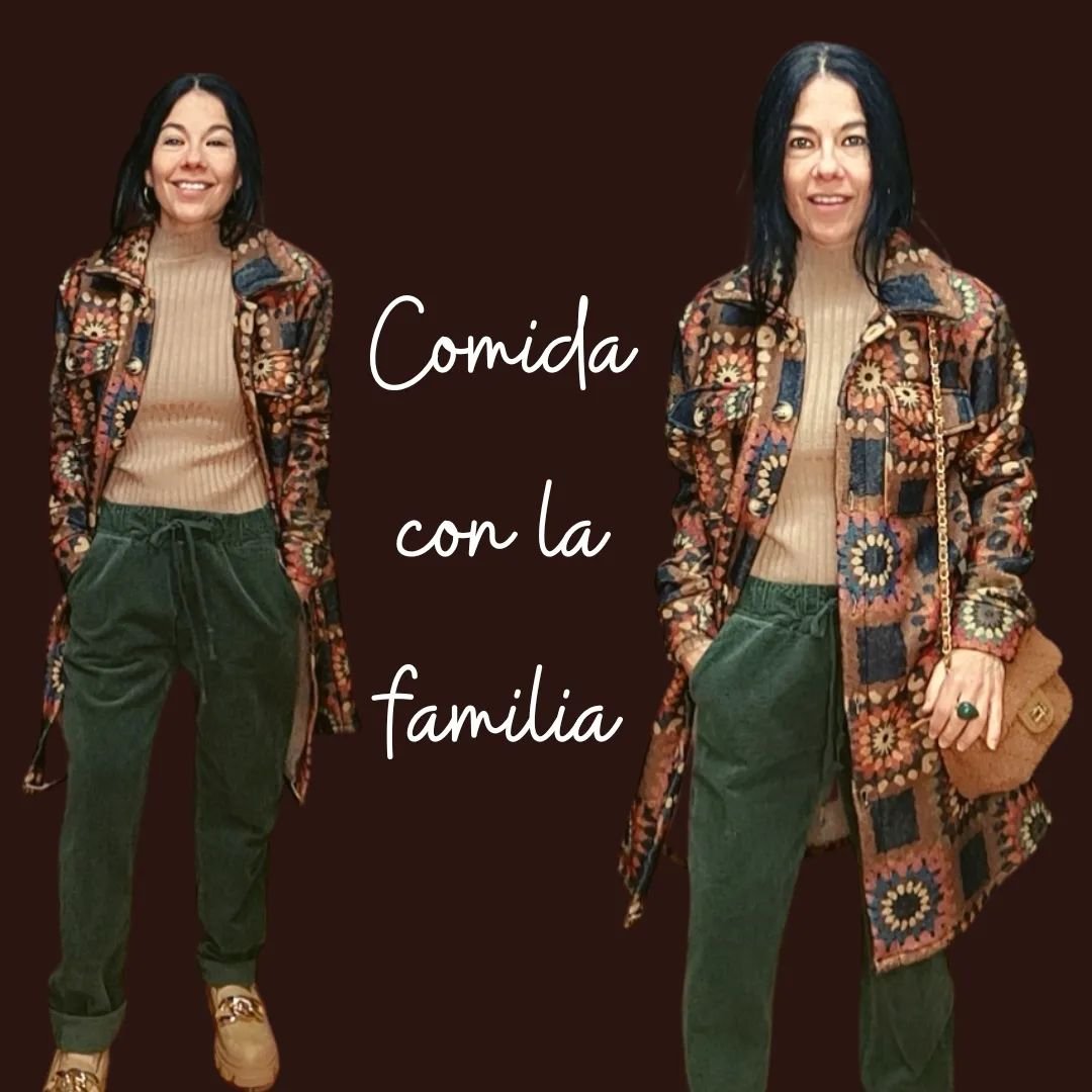 Este look celebra el otoño desde lo afectivo: abrigo estampado con personalidad, suéter de canalé en tono beige que abraza suavemente, pantalón verde relajado y zapatos dorados que aportan luz. El bolso con cadena cierra el conjunto con gesto delicado. Ideal para compartir momentos cercanos, donde el estilo no busca destacar, sino acompañar — como una conversación cálida, como una comida en casa. Vestir desde la emoción, con sencillez y carácter.