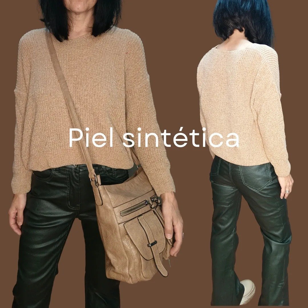 Este conjunto abraza la primavera desde una estética serena y moderna. El suéter beige aporta calidez y neutralidad, mientras el pantalón negro de piel sintética dibuja una silueta pulida y actual. El bolso a juego completa el gesto con intención funcional y estilo sobrio. Una propuesta pensada para mujeres que eligen la calma como fuerza, que visten la temporada con equilibrio, luz y carácter urbano.