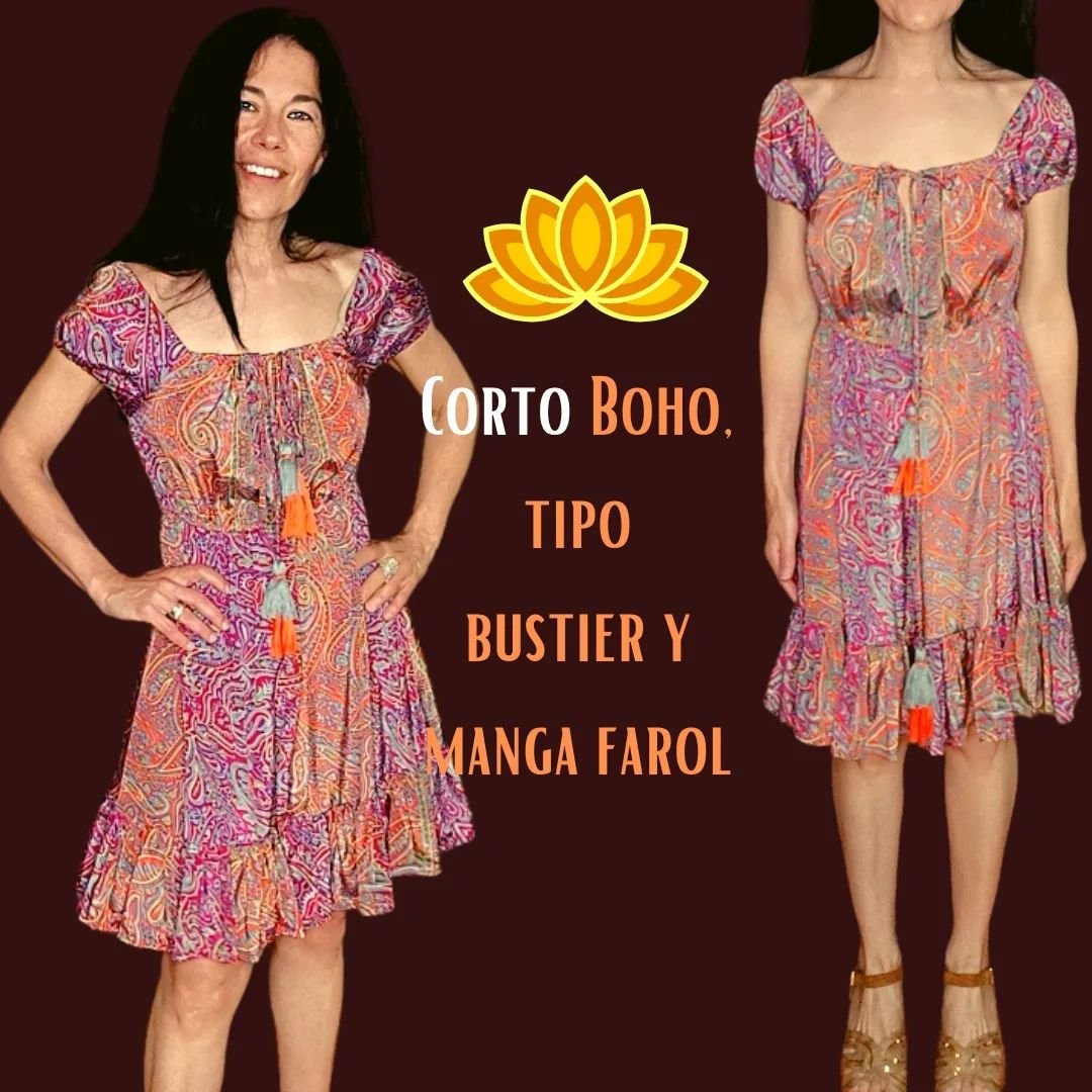 Esta prenda encarna el espíritu bohemio de la primavera: estampado en tonos rosados, naranjas y lilas que celebran la luz cálida de la estación. Su bustier estructurado y mangas farol añaden volumen emocional, mientras los volantes y borlas dan un toque juguetón y ligero. Un vestido pensado para mujeres que caminan con espontaneidad, que bailan entre colores, que celebran el renacer con estilo y alma abierta